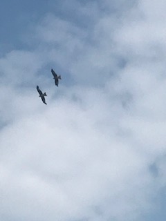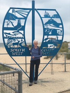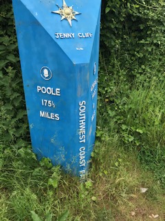 This is a big day. The longest walk so far and also the finish of the coast path trail. (I have yet to do the start and 600 odd miles of the middle bits) My plan has always been to do the walk “in bits” and in no particular order so this is where I can get the picture of the finish sculpture and then fill in the rest over the years. Tom came along on this one too, on a super day, sunny with occasional overcast spells but nice and mild. We had already walked a mile from our hotel in Bournemouth before catching the bus to Swanage but all set up like proper walkers with our sandwiches, water and emergency supplies. How serious are we? Swanage looked quaint but no time to dally. We started off along the promenade towards the chalky distant cliffs. Quite a steep climb up but a few rests along the way and we were on top with only gentle downhill for the rest of the day. Stunning views in all directions. On the headland we were treated to a pair of red kites doing their thing with such ease. A bird we don’t have in Devon – yet. Matching the sky and stunning sea we saw blue butterflies. Adonis blue and chalk hill blue. Thank you to the I-spy book of blue things. Old Harry Rocks looked spectacular in the sun, a hot part of the walk with no shade and every seat taken with people enjoying the views. Across the water the Needles sing out in unison. Further along we got down to the beach and a much needed lunch break. Studland bay stretches out ahead and was a tad overwhelming but there are civilised facilities. Step by step the distance lessened and looking back is more heartening than forwards. Looking anywhere while passing through the nudist beach is tricky but a wind had whipped up so some covering up had occurred. If I ever do this walk again I must remember that low tide is the best time to walk, on the hard wet sand as opposed to the soft sand higher up the beach and, even worse – the dunes. Shell bay at the end of the walk comes up fast, thankfully, and suddenly we are a short stroll from the Sculpture. We both felt elated despite wrecked knees. A few folk were taking pictures at the Sculpture and some offered to take some of us. Inevitable conversations struck up about the walk, had we done it in one go, how long did it take and so on. We skulked off quietly as those who had completed 630 miles deserved to enjoy their moment. One day, maybe and hopefully I will also be a completer even if it has been “in bits”.